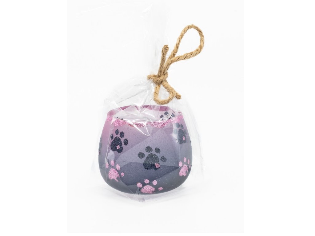 Skleněný kalíšek na čajovou svíčku v barvě růžovo-šedé, zdobený třpytivými packami. Kalíšky pocházejí z české sklárny Sázava. Na výrobu je použito kvalitní varné sklo Simax. Sklo se postříbří (pro lepší transparentnost a lesk) a potom se smáčí do různých barev. Po zaschnutí barvy přijde na řadu malířka, která štětcem (většinou z veverčí či kuní srsti), lepidlem a posypem kalíšky dekoruje.